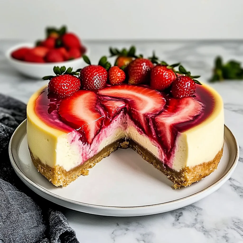 Creamy texture that melts in your mouth, thanks to the silky cream cheese and rich sour cream. Fresh strawberries bring a burst of sweetness, making each slice a delightful experience. Easy preparation means you can whip this up in just 30 minutes, perfect for any occasion. Crowd-pleaser status is guaranteed—everyone will be asking for seconds! Plus, the stunning presentation of vibrant strawberry swirls elevates your dessert game effortlessly.