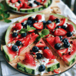Watermelon Pizza with Yogurt and Berries is a vibrant, refreshing dessert that transforms summer’s favorite fruit into a delightful pizza. This easy-to-make treat features juicy watermelon slices topped with creamy Greek yogurt and an assortment of colorful berries. Drizzled with honey and garnished with fresh mint, it’s a guilt-free indulgence perfect for hot days, pool parties, or healthy snacking. Enjoy the bright flavors and nutrition in each bite!